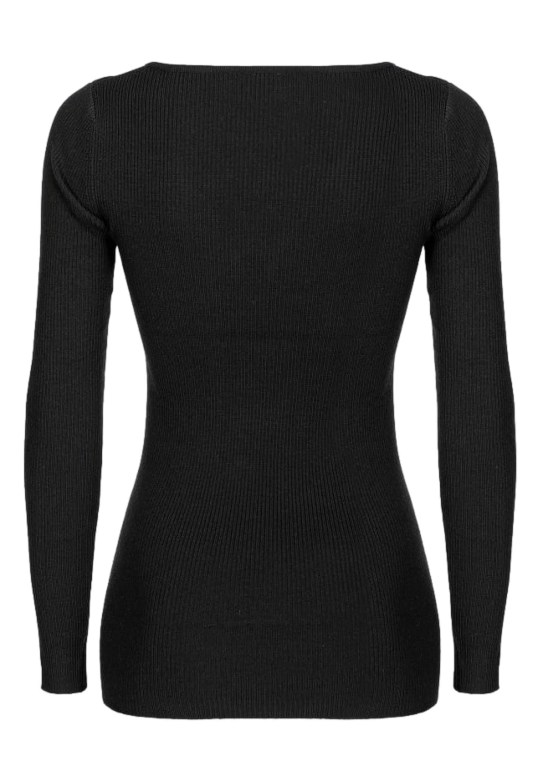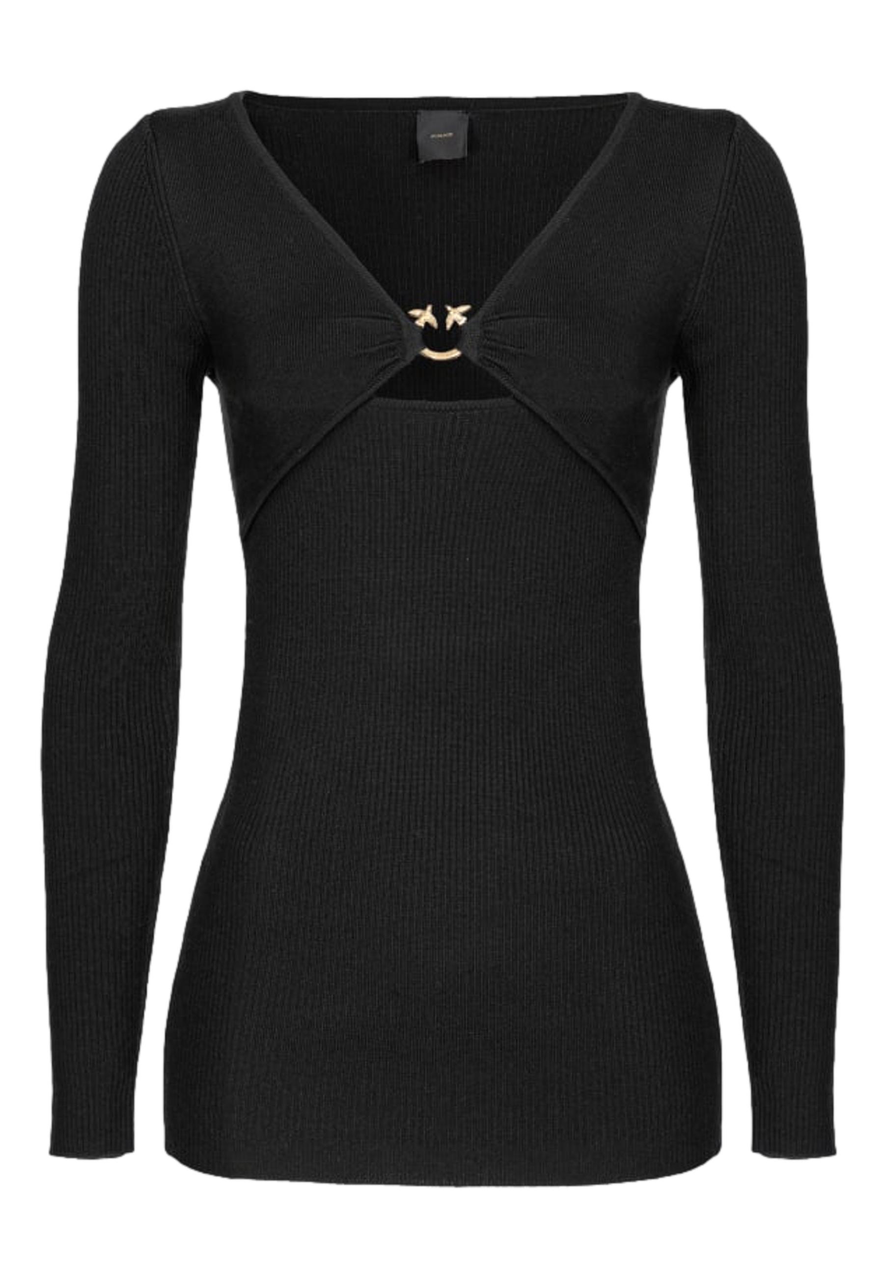 Maglia a maniche lunghe in morbido filato di lana stretch lavorato a costine. Linea aderente, con scollo a V costruito con due pannelli laterali e caratterizzato da cut-out e mini fibbia Love Birds in metallo dorato.