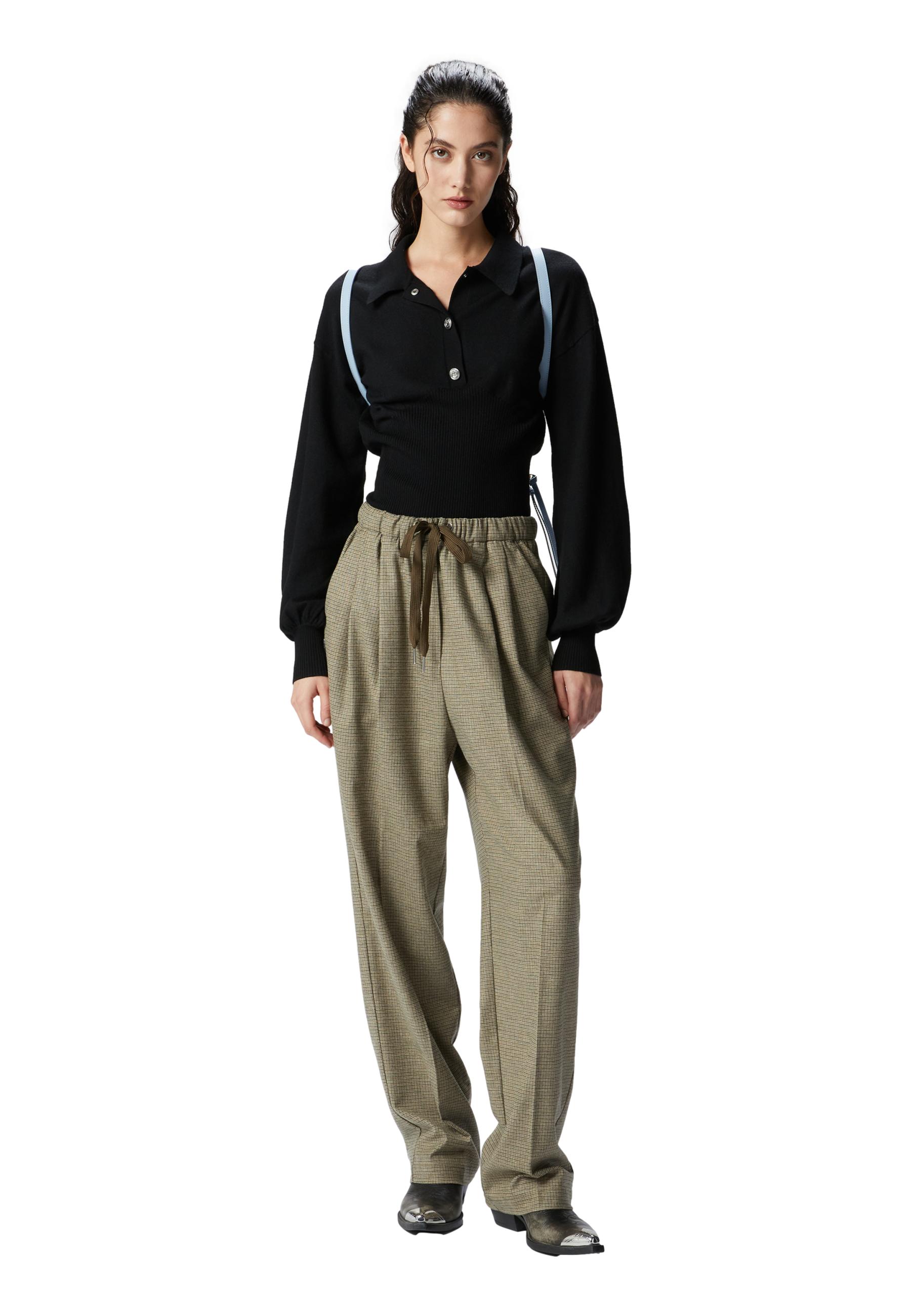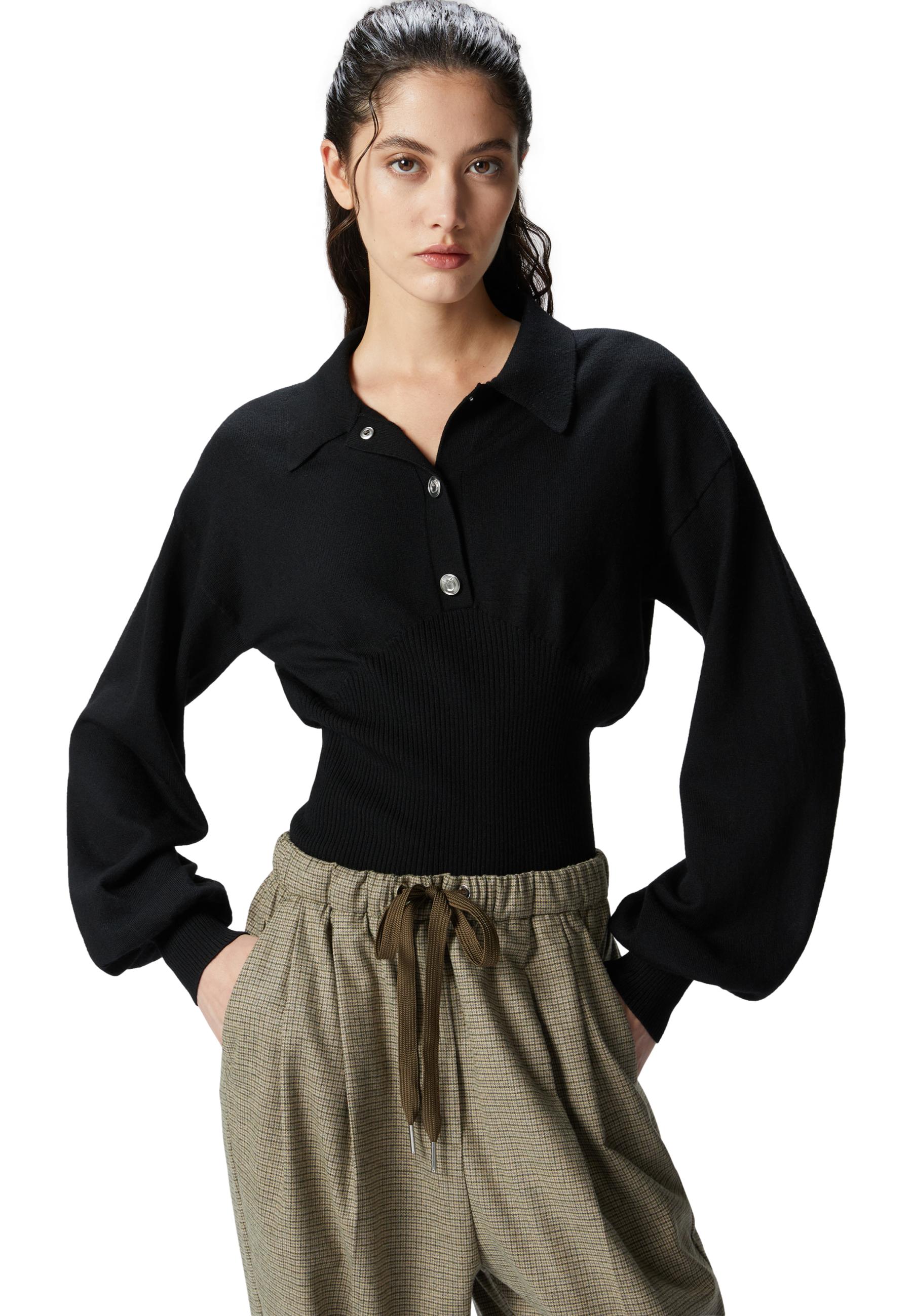 Maglia polo in morbido filato di misto lana contraddistinta dal classico colletto a camicia e tre bottoni in metallo, personalizzati con logo uccellini Love Birds. Il fondo capo, lavorato a costine, è più stretto e aderisce al corpo, enfatizzando le linee più morbide della parte superiore e delle maniche lunghe a giro leggermente basso. La maglia è perfetta da indossare in abbinamento con pantaloni o minigonne a vita alta, regalando al tuo look uno stile unico.
