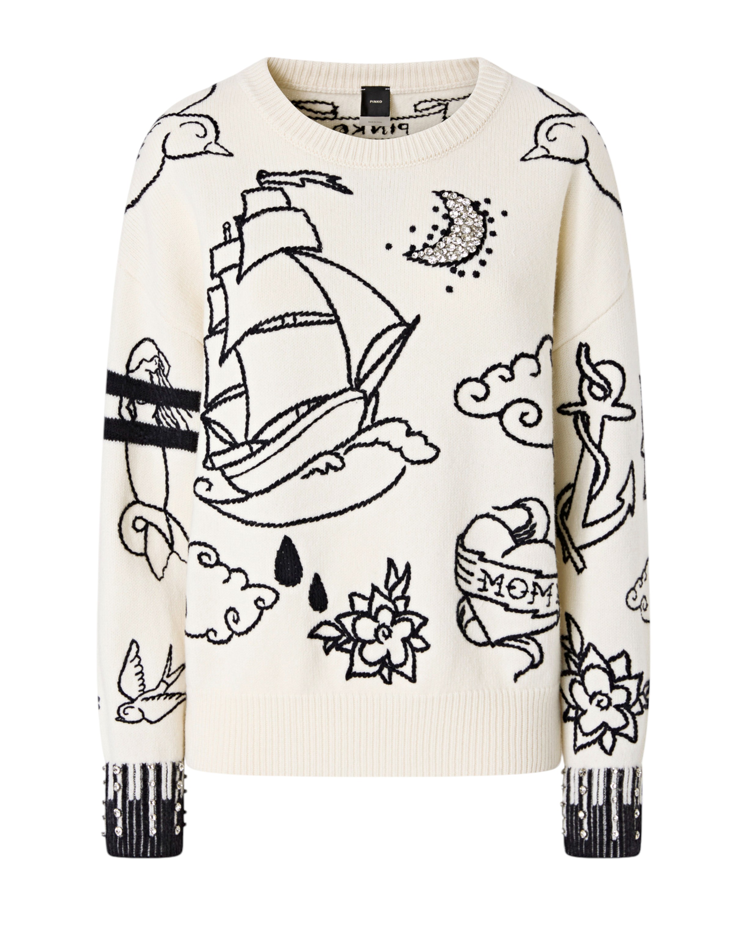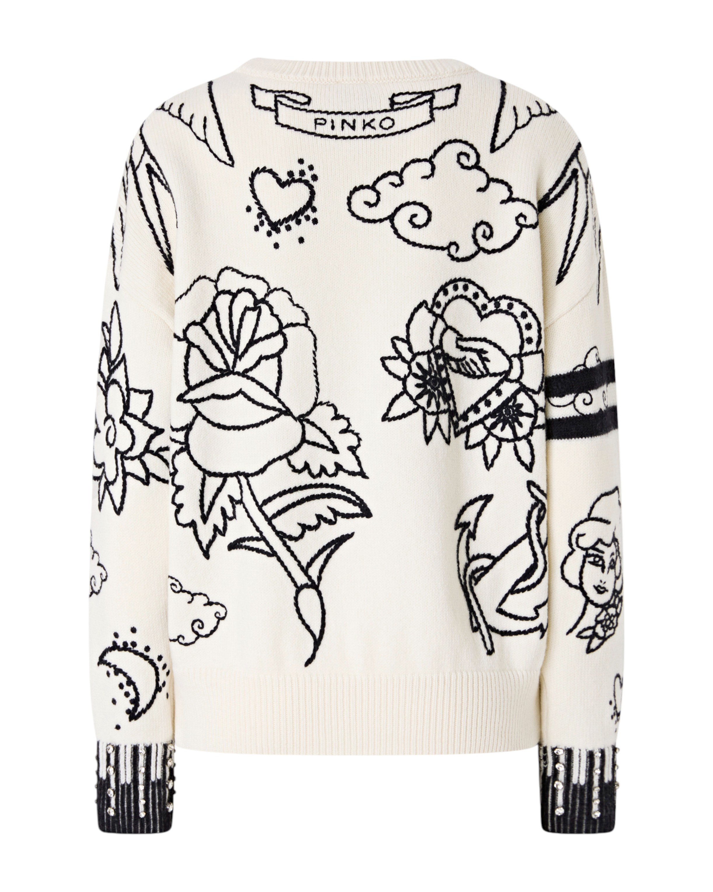 Maglione girocollo a maniche lunghe in lana merino: un filato soffice e leggero per un guardaroba originale. Sfoggia un look inedito con questo design ricco di fantasie ricamate e dettagli di strass sui polsini. Girocollo, orlo e polsini sono lavorati a coste, mentre il tocco finale è dato dal logo lettering PINKO sul retro del design. Il capo è stato sottoposto a prove di finissaggio per ridurre al minimo la possibile formazione di pilling, garantendo una maggiore morbidezza e durabilità del tessuto.