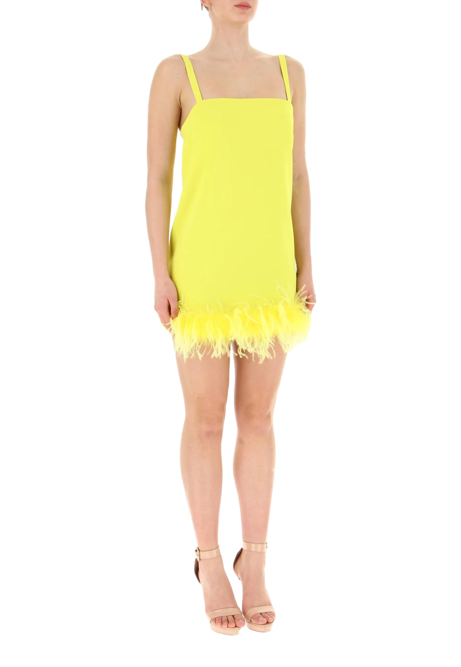 Abito corto senza maniche stile slipdress in tessuto crêpe stretch. Linea dritta, con spalline sottili, scollo squadrato e fondo capo profilato con piume in tono colore. Chiusura con zip invisibile nel centro dietro.