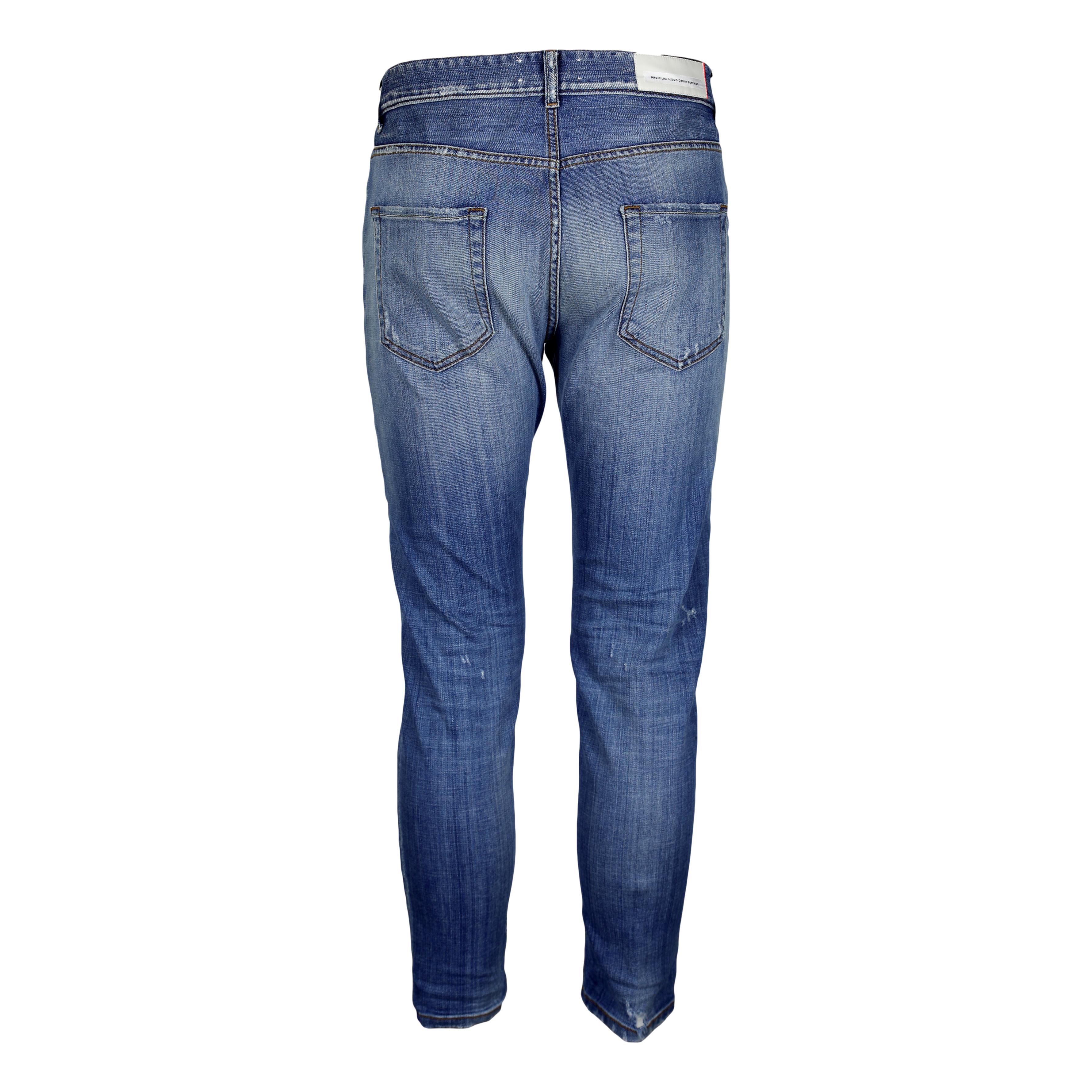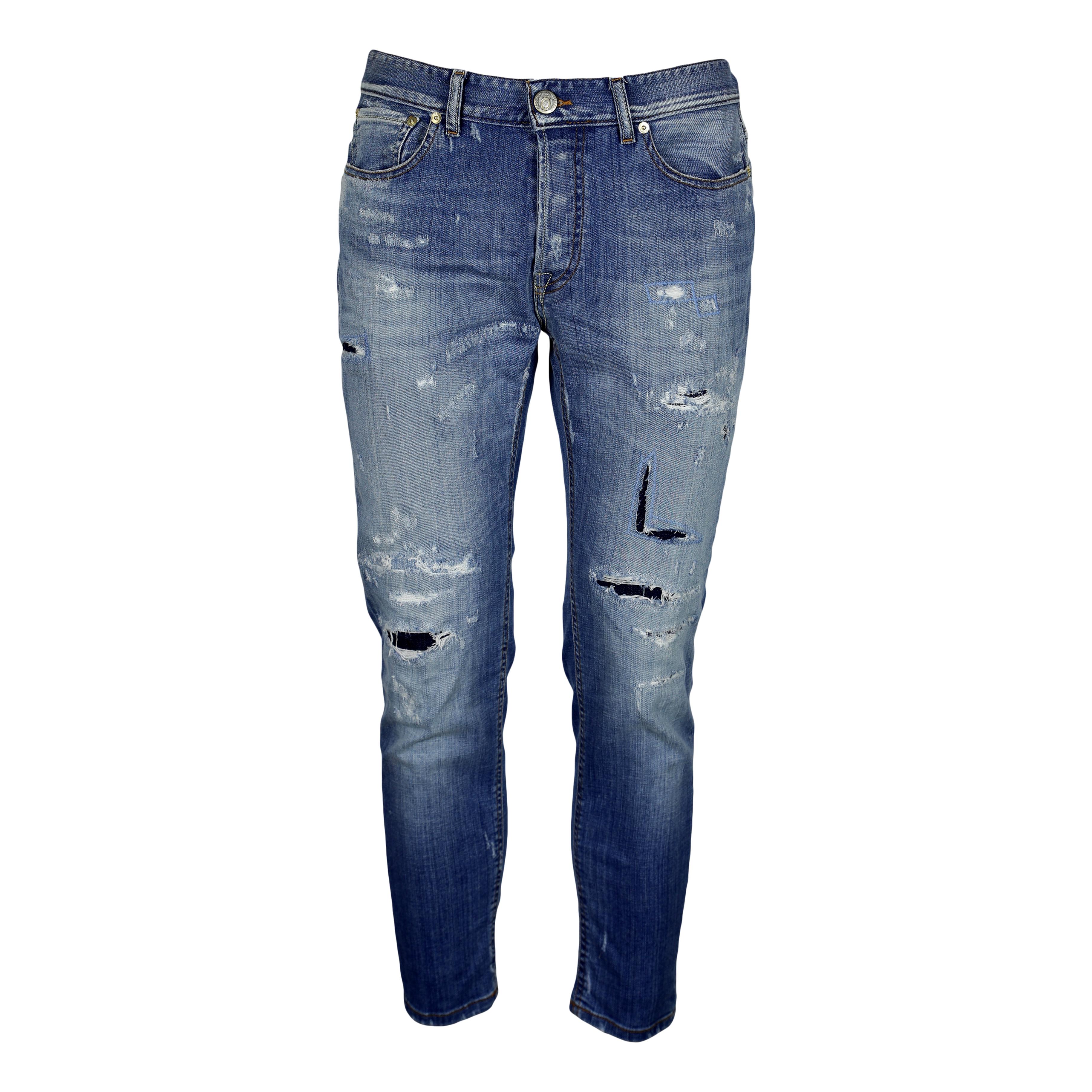 Jeans PMDS in denim stretch. Chiusura frontale con bottoni. 5 tasche. Microrotture e rattoppi. Passanti per cintura. Etichetta logo applicata sul retro.