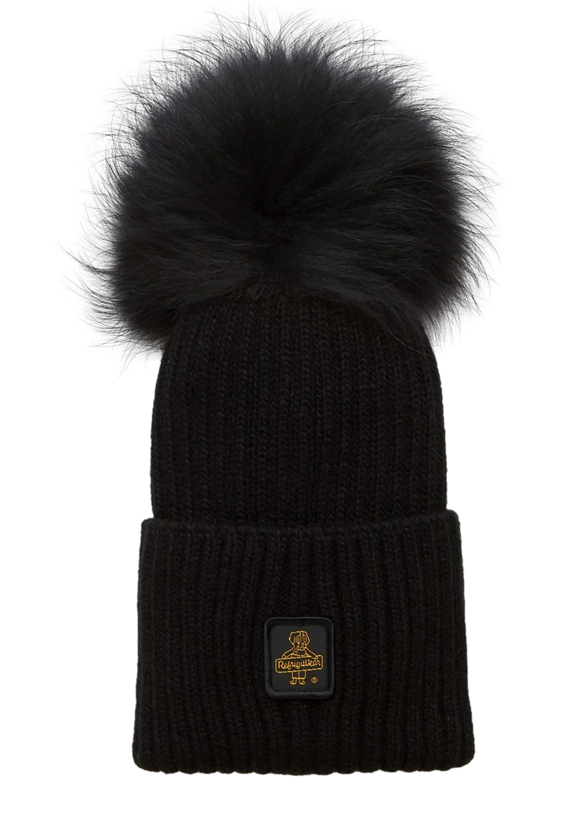 Cappello in lana a coste. Pompon in pelliccia . Bordo risvoltabile. Patch logo ricamato sul risvolto.