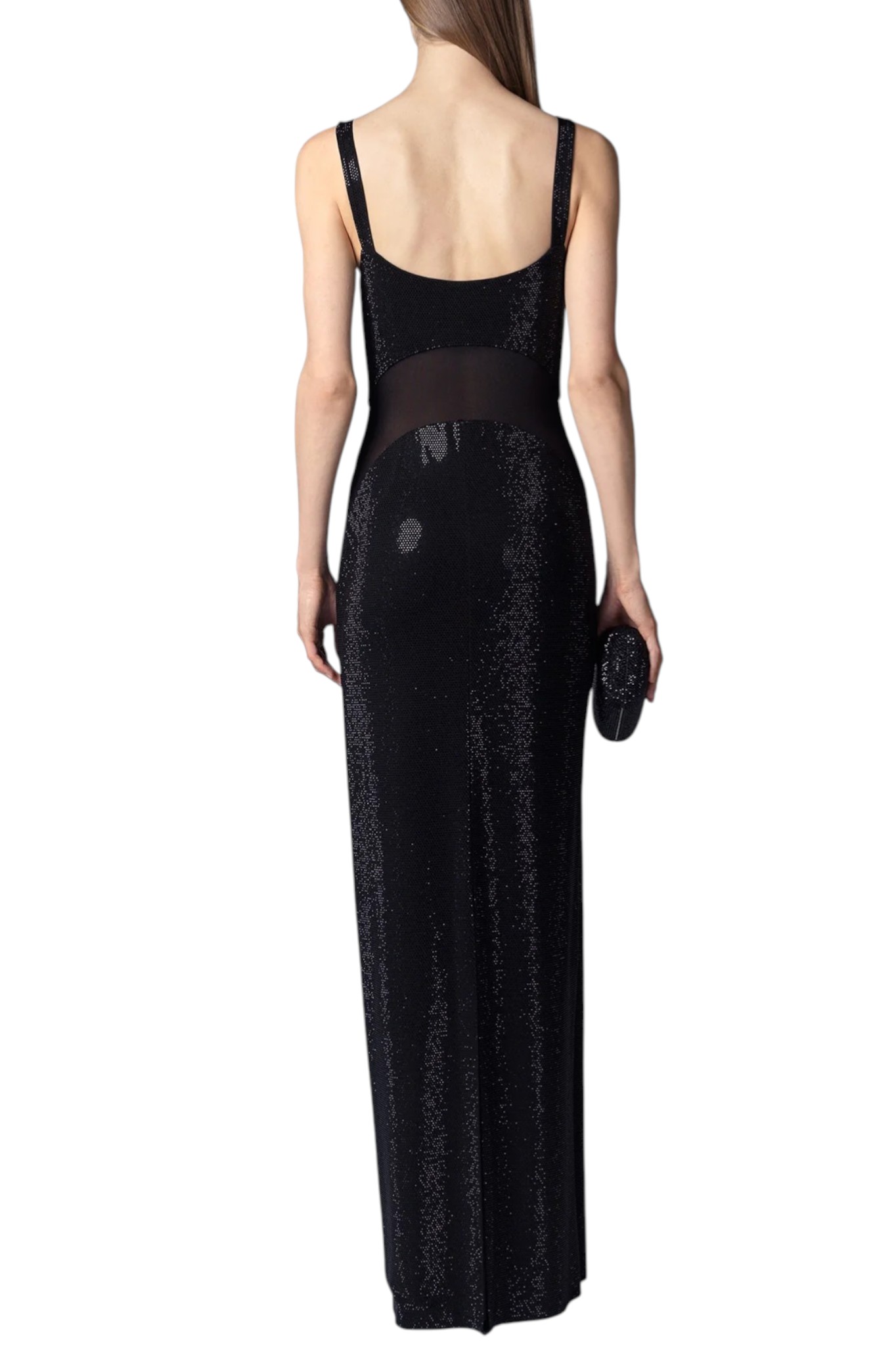 Abito lungo realizzato in tessuto tecnico elasticizzato, caratterizzato da un design strutturato e continuo. Il corpetto e la gonna sono tempestati di strass applicati in modo uniforme, mentre la parte centrale in tulle monocolore crea un inserto a contrasto che alleggerisce la costruzione del capo. Lo spacco centrale sul retro accompagna il movimento mantenendo una linea definita e una vestibilità regolare.