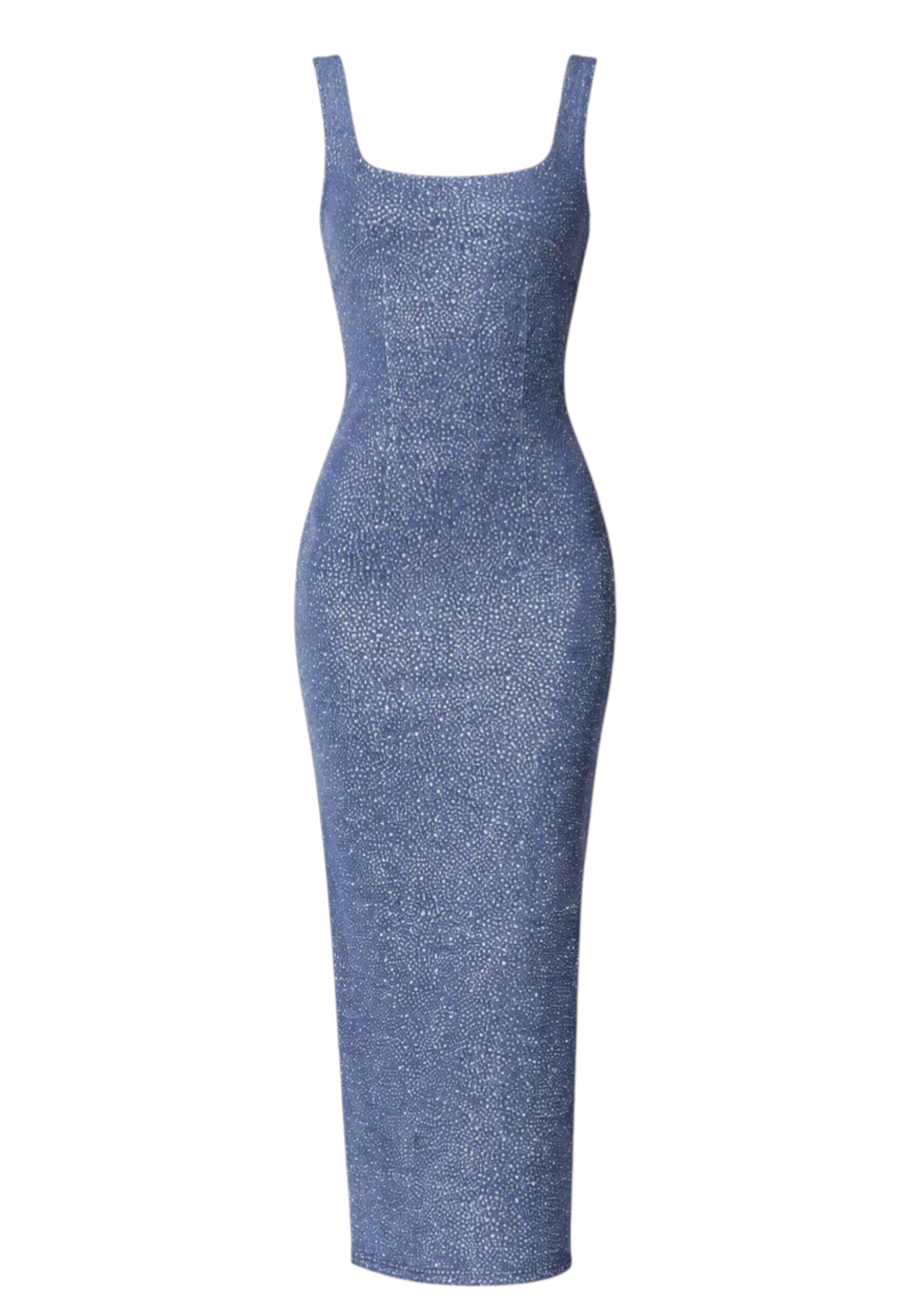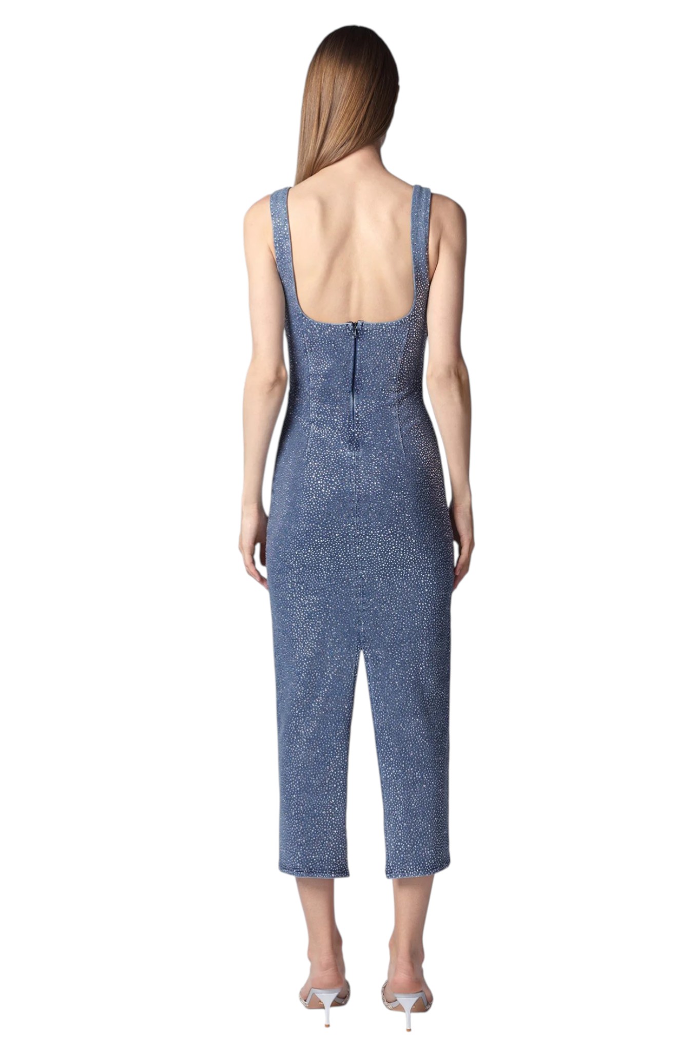 Abito tubino lunghezza midi realizzato in denim elastico, caratterizzato da una linea aderente e compatta. La superficie è interamente rivestita da micro strass crystal in diverse dimensioni, applicati in modo uniforme per creare una texture luminosa controllata. La costruzione segue il corpo con precisione, mentre la chiusura con zip sul retro mantiene il design pulito e funzionale. La vestibilità è regolare, con attenzione alla resa del materiale e alla continuità delle linee.