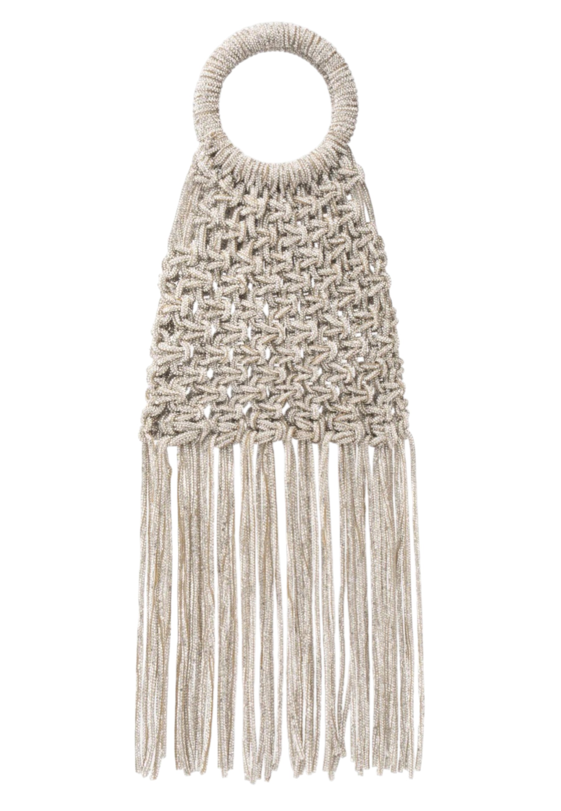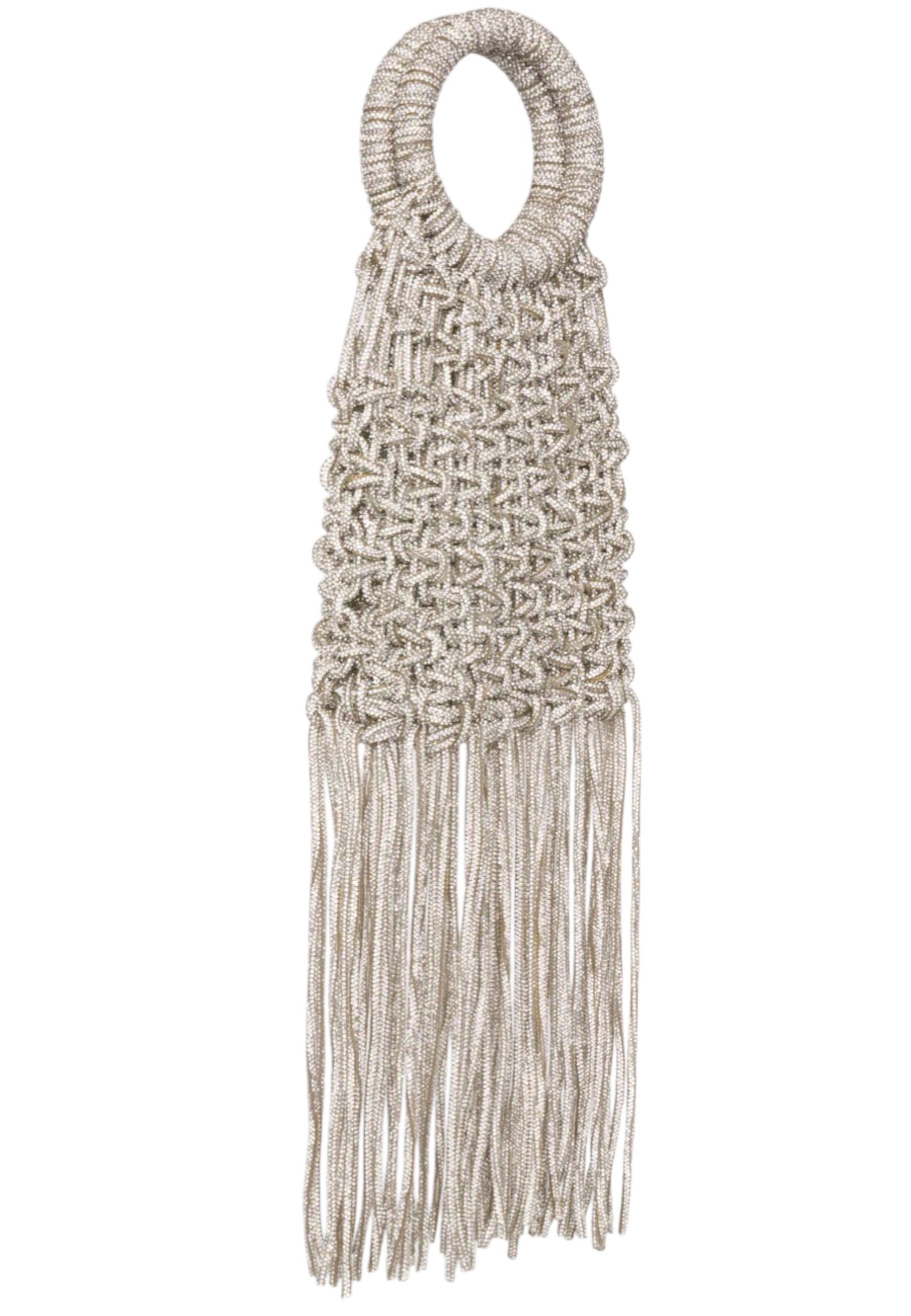 Handbag Maronti color argento caratterizzata da una costruzione scultorea con nodi tempestati di cristalli, applicati per creare una superficie luminosa e tridimensionale. I trim finali pendenti completano il design con un movimento controllato, integrandosi nella struttura del modello senza alterarne l’equilibrio. La linea compatta valorizza la lavorazione in cristalli mantenendo proporzioni definite.