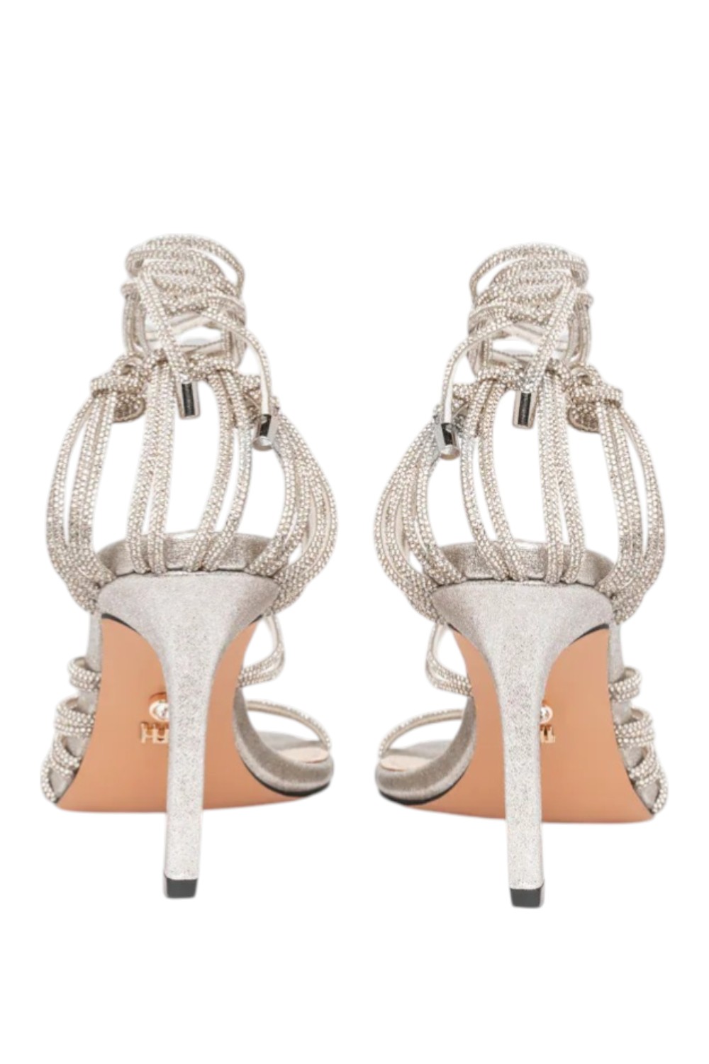 Sandalo Molì color argento caratterizzato da trim gioiello intrecciati applicati come elemento centrale del design. La costruzione mantiene una linea definita e una resa luminosa controllata, mentre il tacco da 9 cm struttura la silhouette della calzatura garantendo proporzioni equilibrate e stabilità. Il profilo essenziale valorizza il dettaglio intrecciato senza appesantire la forma.