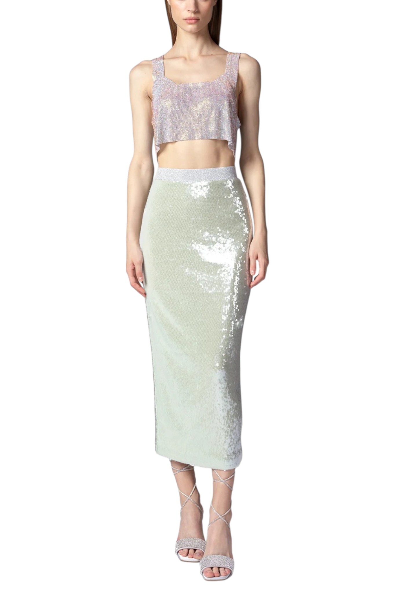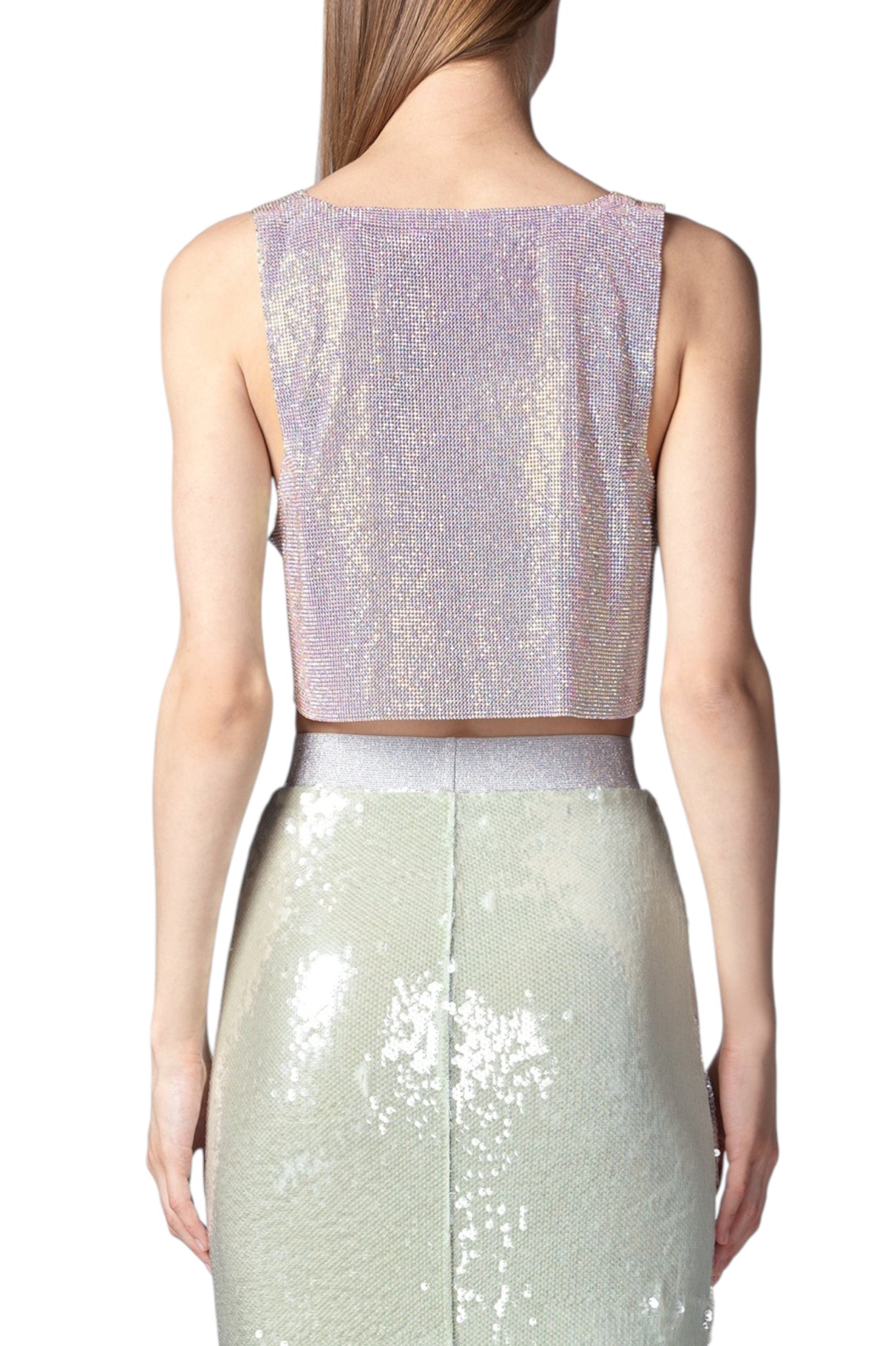 Top crop New Atene realizzato in maglia strass color crystal-AB, caratterizzato da uno scollo canotta classico e da un giro braccio ampio che definisce il volume del capo. La costruzione in maglia metallica con applicazione di cristalli crea una superficie compatta e luminosa, mantenendo una struttura fluida. Il modello presenta una vestibilità over, studiata per garantire comfort e proporzioni equilibrate.