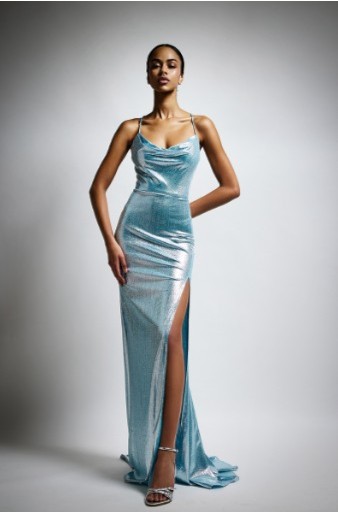 Brilla in ogni occasione con questo elegante abito a sirena realizzato in tessuto con riflessi argentei , perfetto per eventi serali, cerimonie o feste glamour. Il taglio aderente esalta le forme, mentre la gonna a sirena dona un tocco di drammaticità e raffinatezza al look.