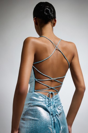 Lo scollo profondo sulla schiena, incorniciato da sensuali stringhe incrociate, aggiunge un dettaglio audace e sofisticato. Il tessuto riflettente cattura la luce, creando un effetto scenico e moderno.
