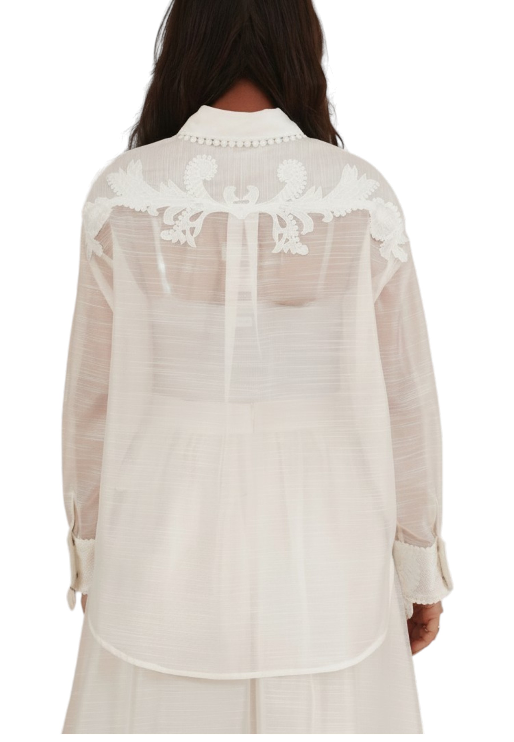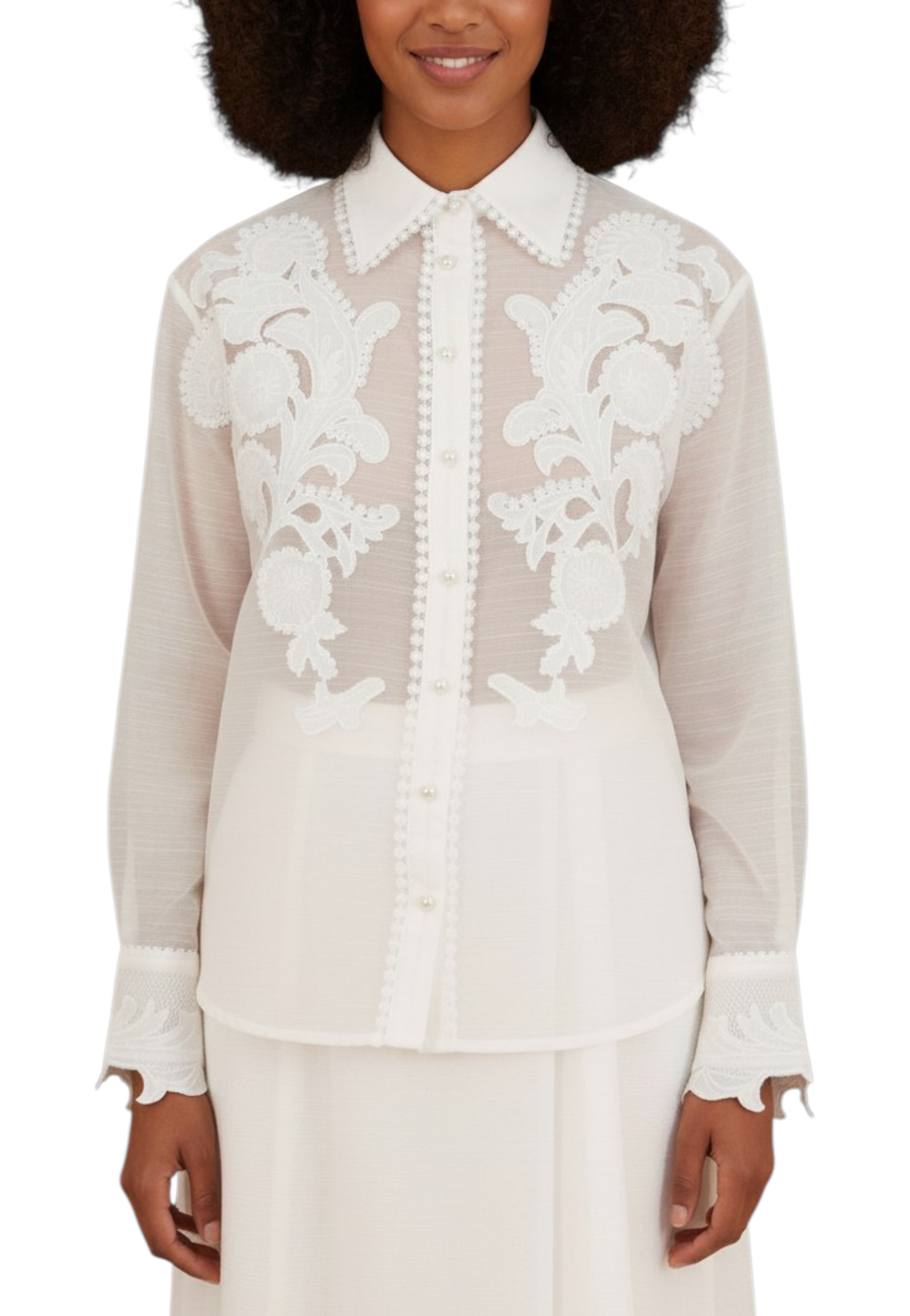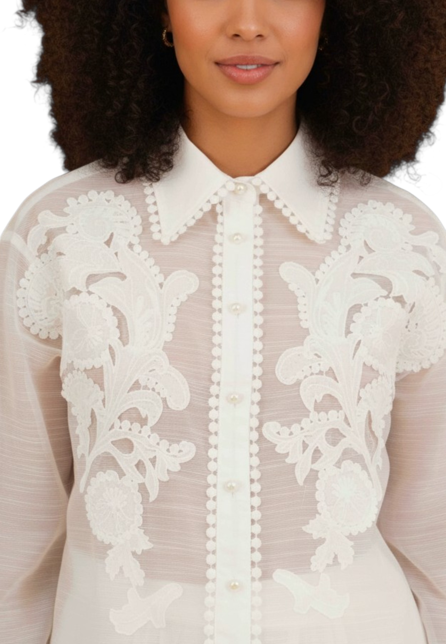 Dotata di chiusura con bottoni, è impreziosita da raffinati dettagli di ricamo sul davanti e sui polsini, che aggiungono un tocco distintivo e ricercato. Il taglio valorizza la silhouette, rendendola ideale per occasioni speciali, serate o outfit sofisticati.