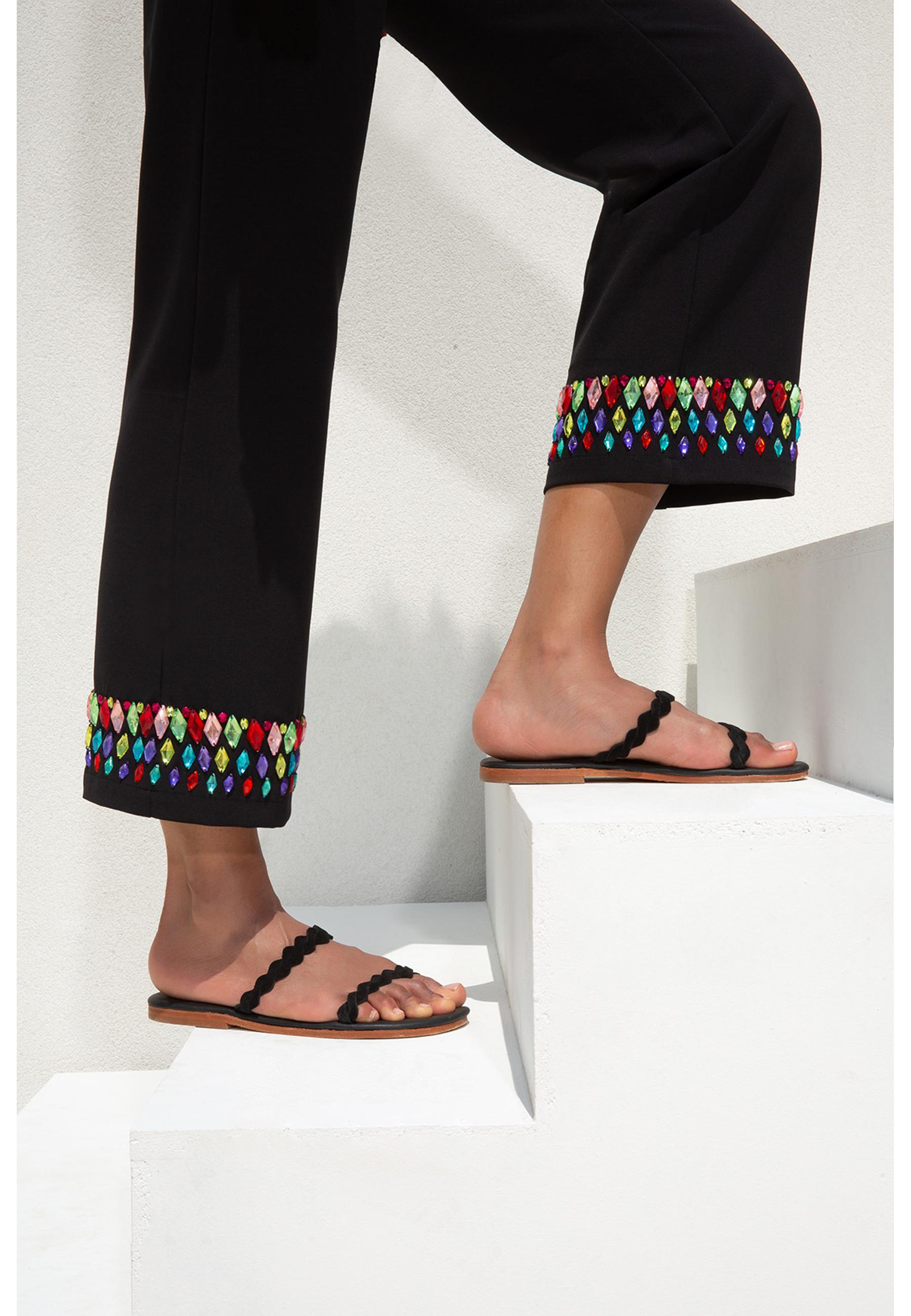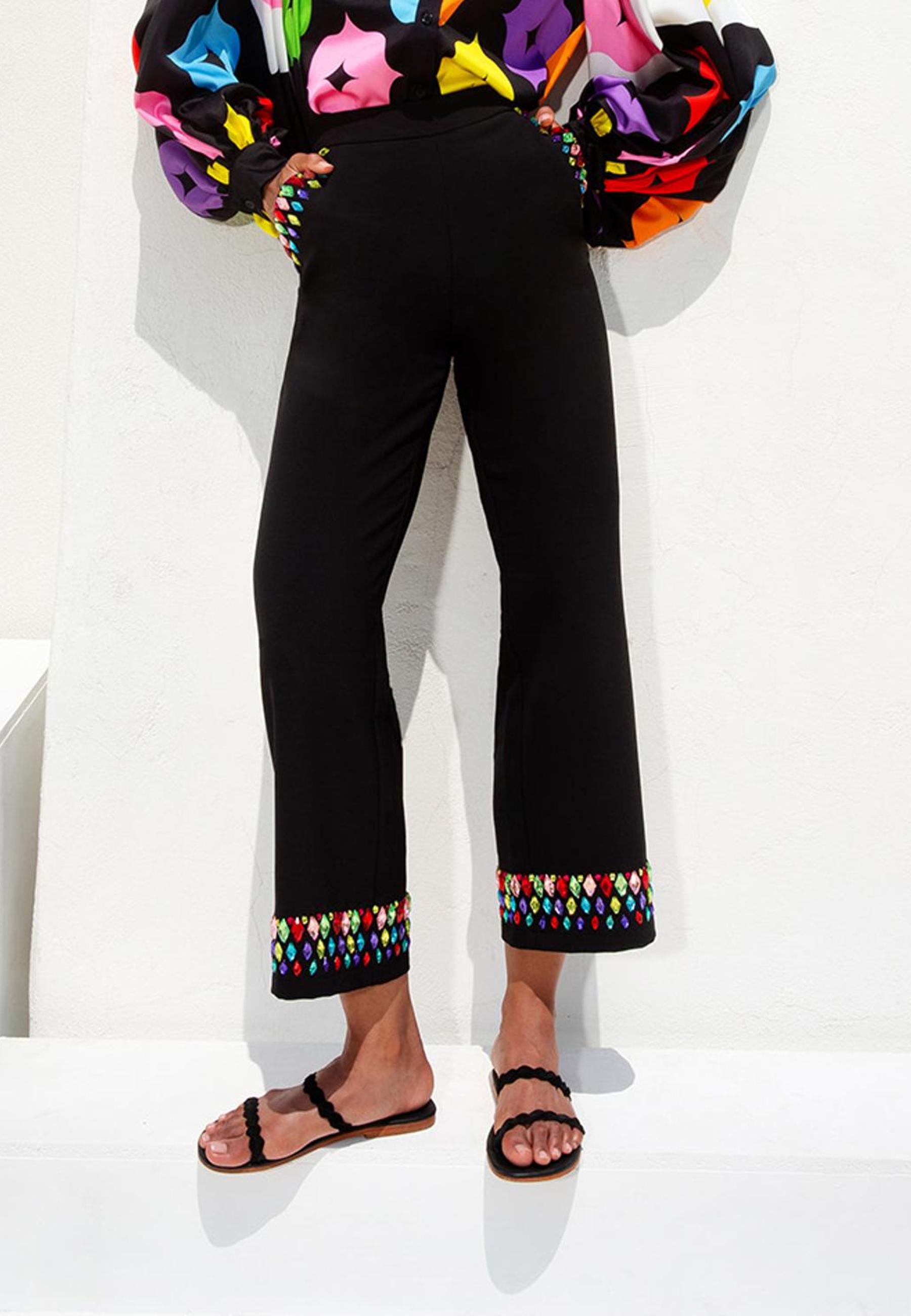 Pantaloni con applicazioni di pietre multicolor sulle tasche e sul fondo.