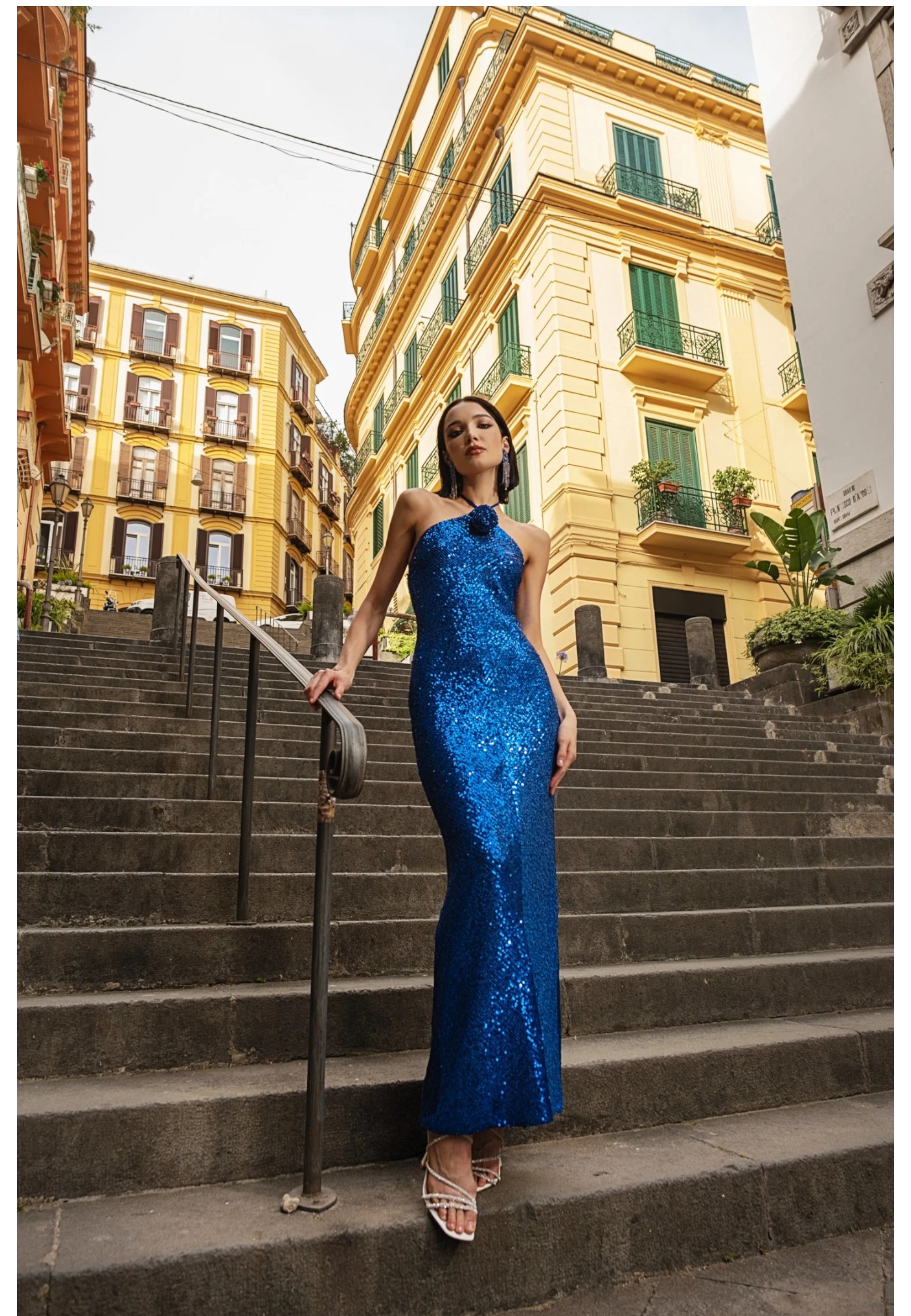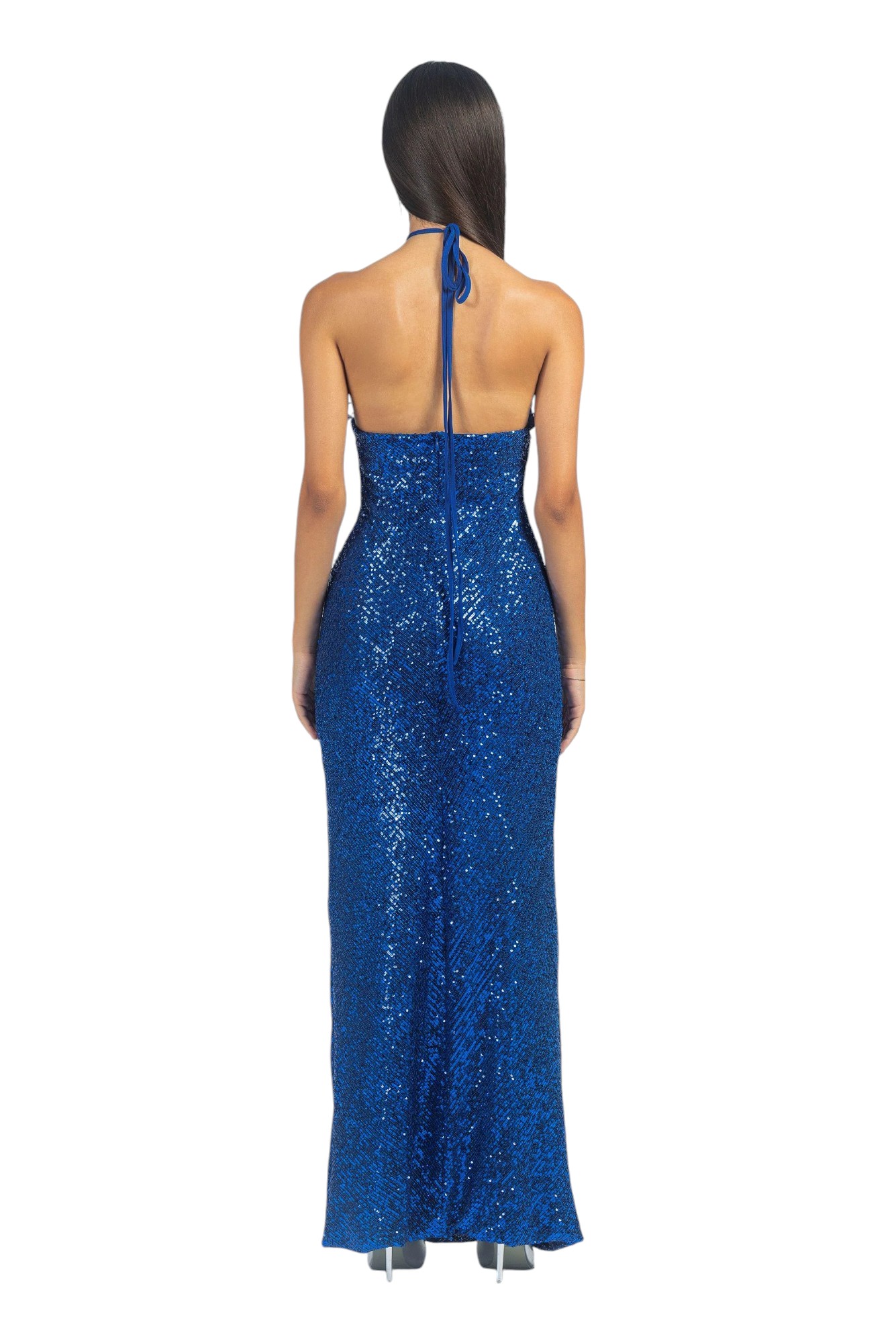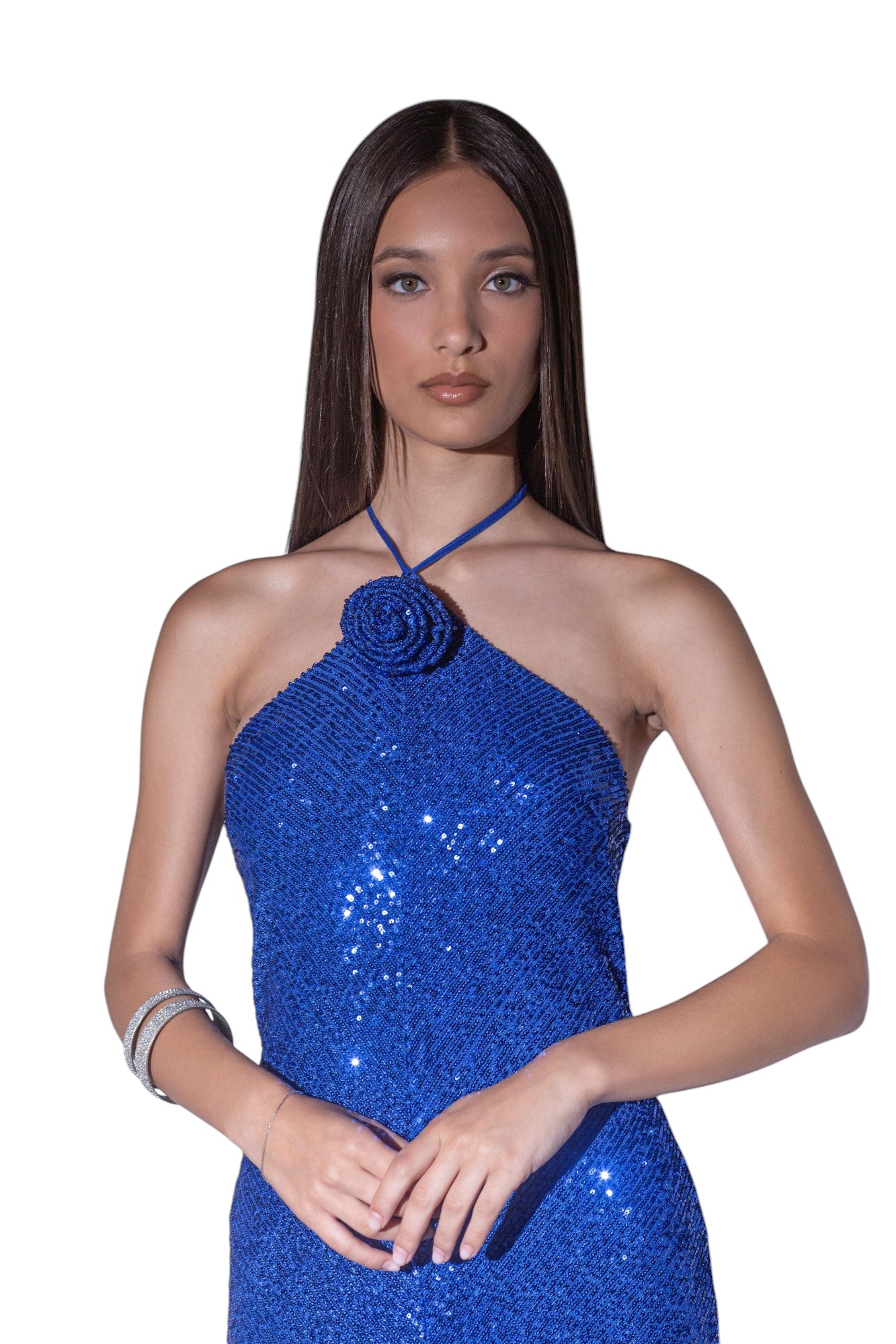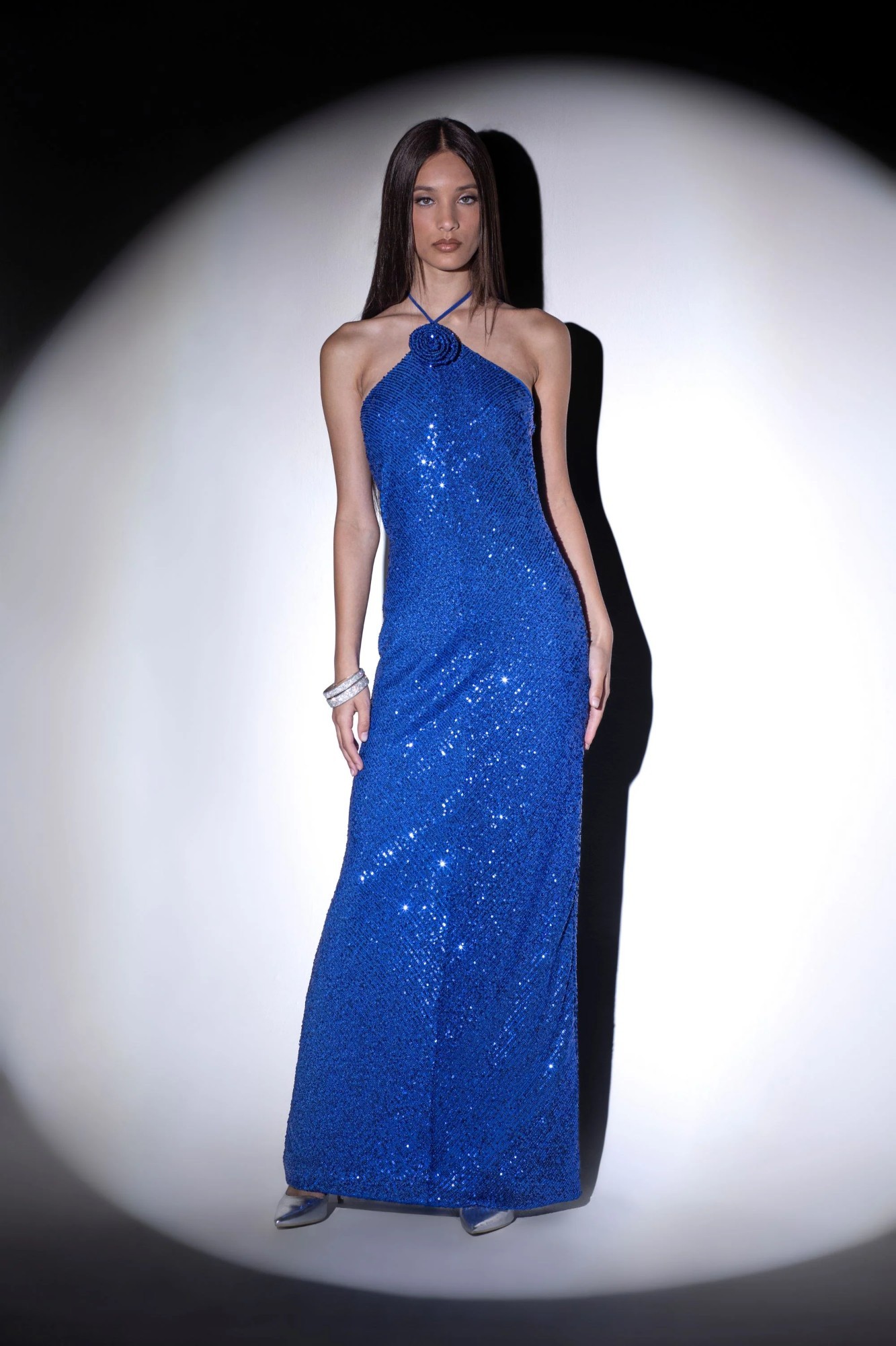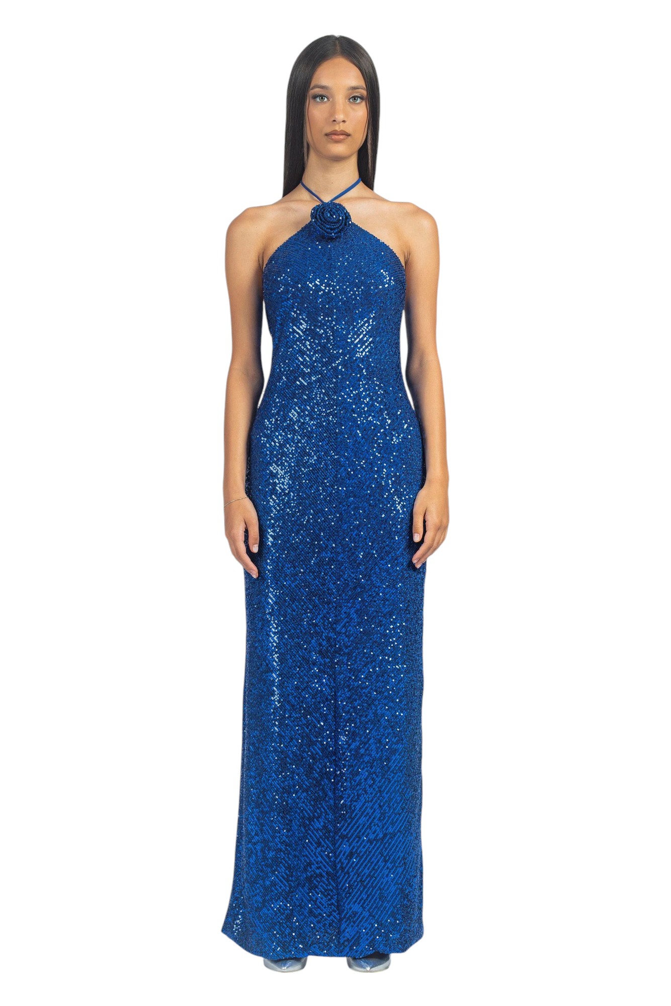 Abito lungo in pailettes con scollo america e rosa applicata.