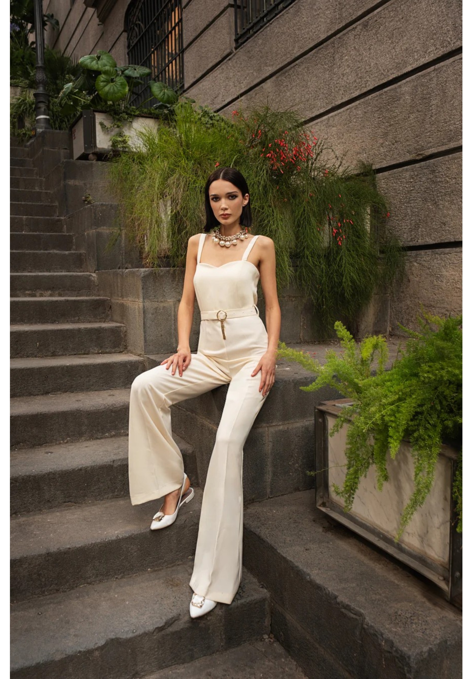 Tuta in cady con scollo a cuore e pantalone dalla linea a zampa con cintura in vita con accessorio.Apertura con zip sul centro dietro , completa il coordinato la maglia in rete strass con giro sceso.