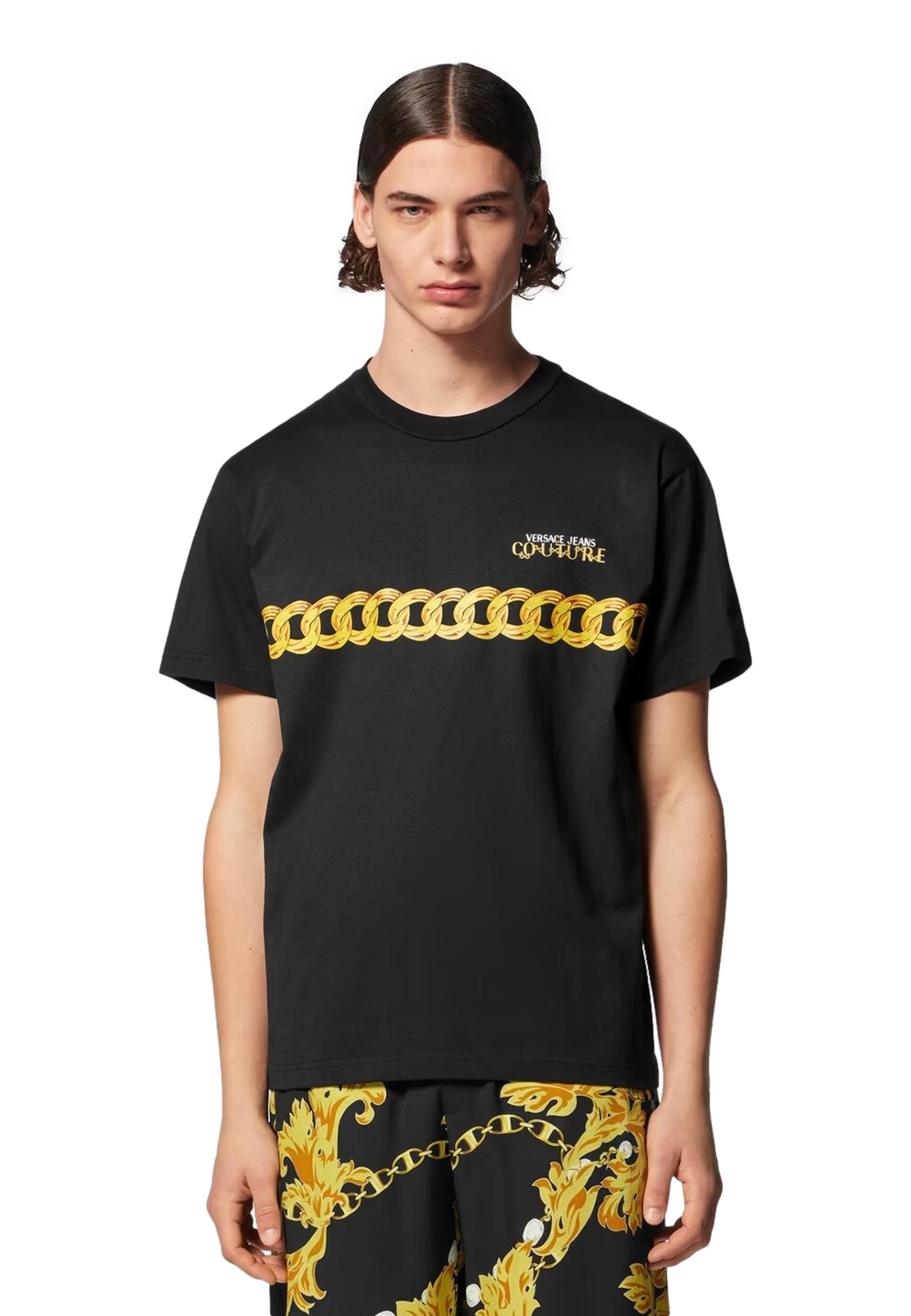 Nero, cotone, stampa con catene, stampa con logo sul petto, girocollo, maniche corte e orlo dritto.