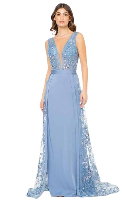 Questo incantevole abito in delicato azzurro polvere è pensato per chi desidera un look romantico, sofisticato e sorprendente. Il corpetto, finemente ricamato con motivi floreali , avvolge il busto con una linea strutturata ma femminile, mentre la sopragonna ricamata aggiunge un tocco regale e scenografico.